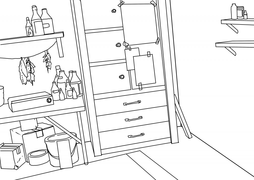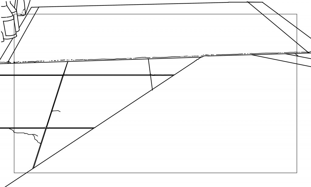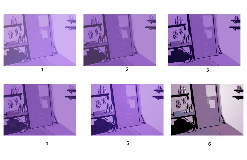 Our Art Director gave me a rough color key of what she wanted the fight scene to look like, as well as directions . Using the team’s 3D set of the room and the storyboard panel, I made a layout of the space. Our Art Director wanted the scene to contrast harshly with the tender scenes at the beginning of the story, so we went for a strong, graphic look. I explored a few different variations of what “strong and graphic” might look like in the scene.