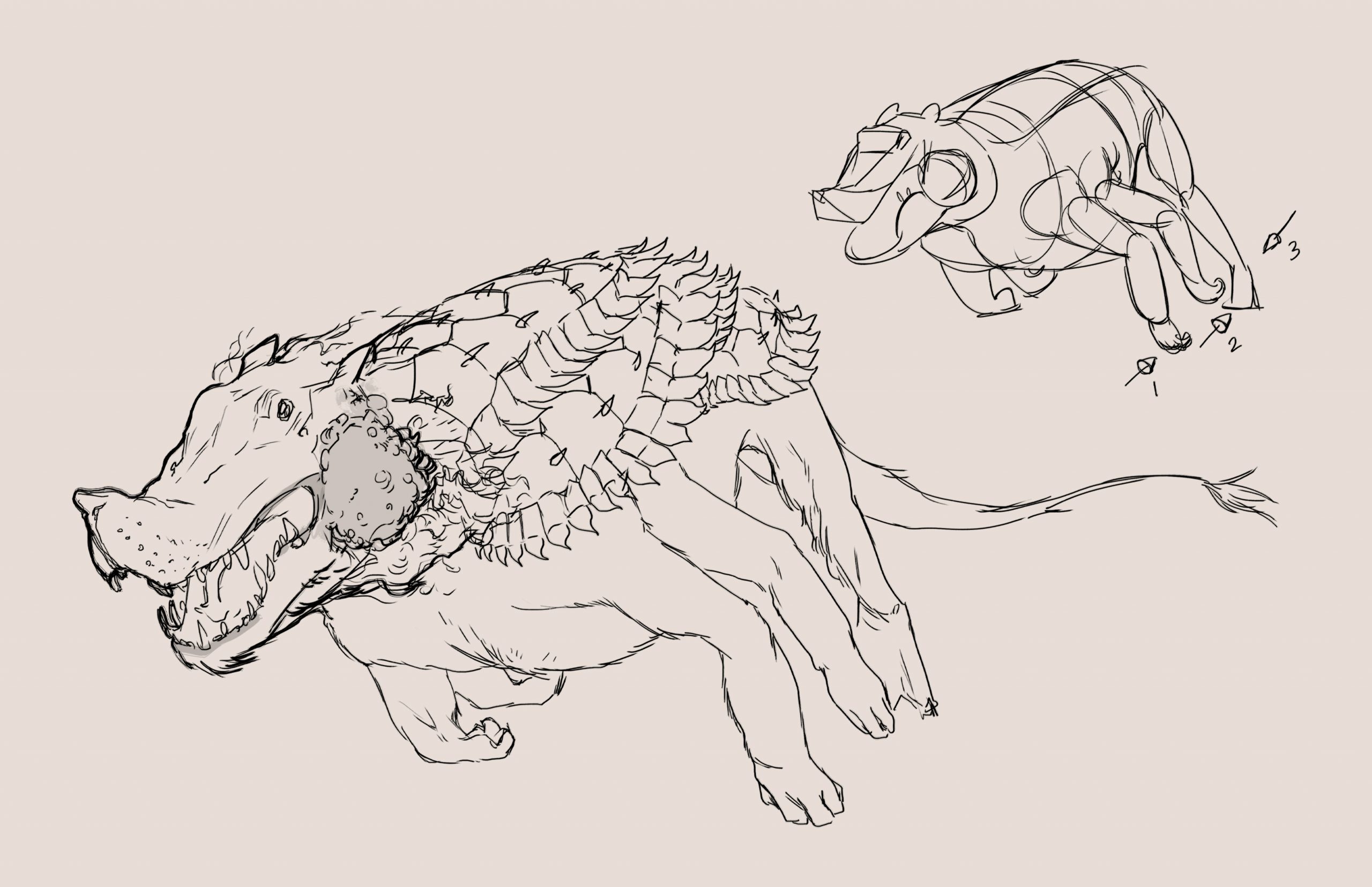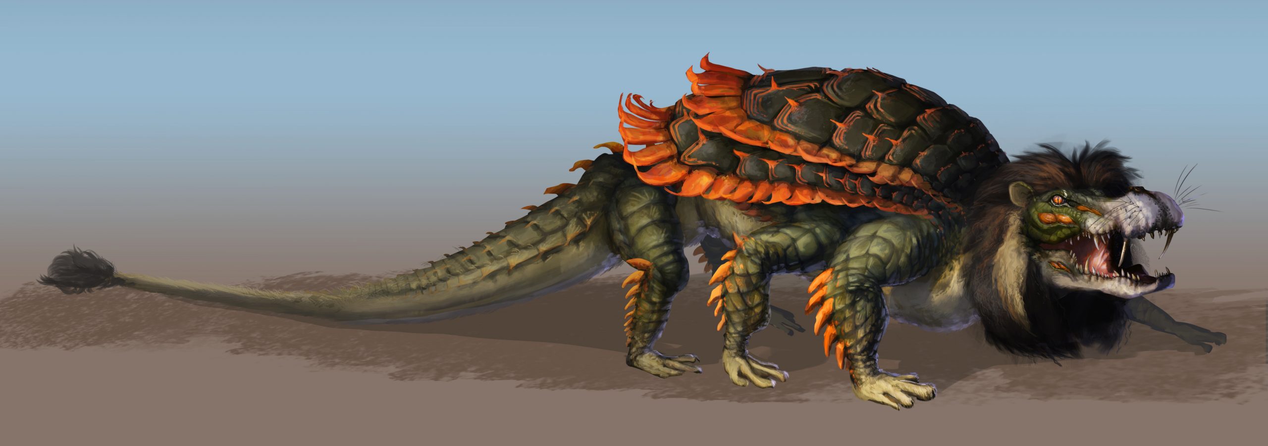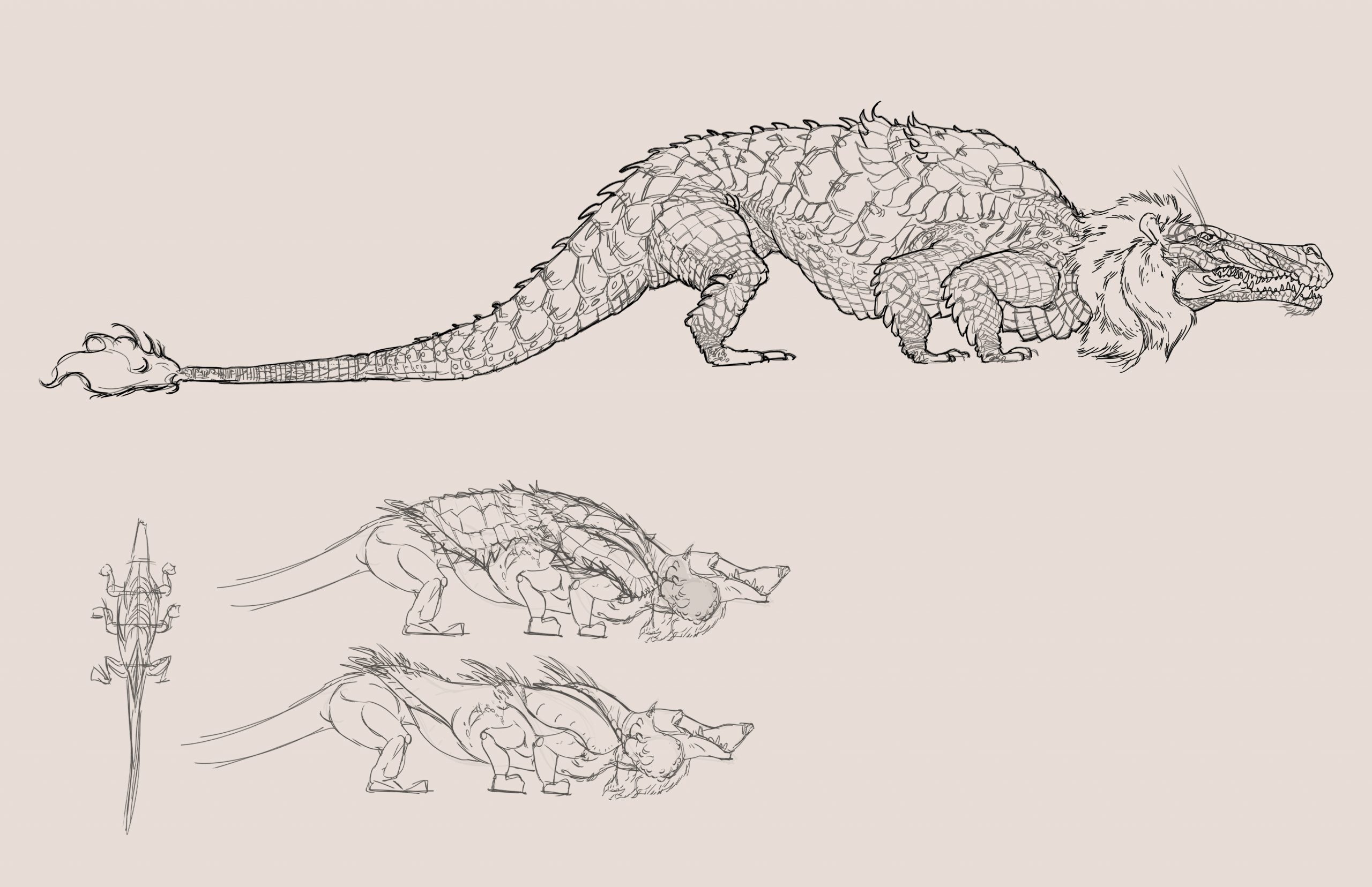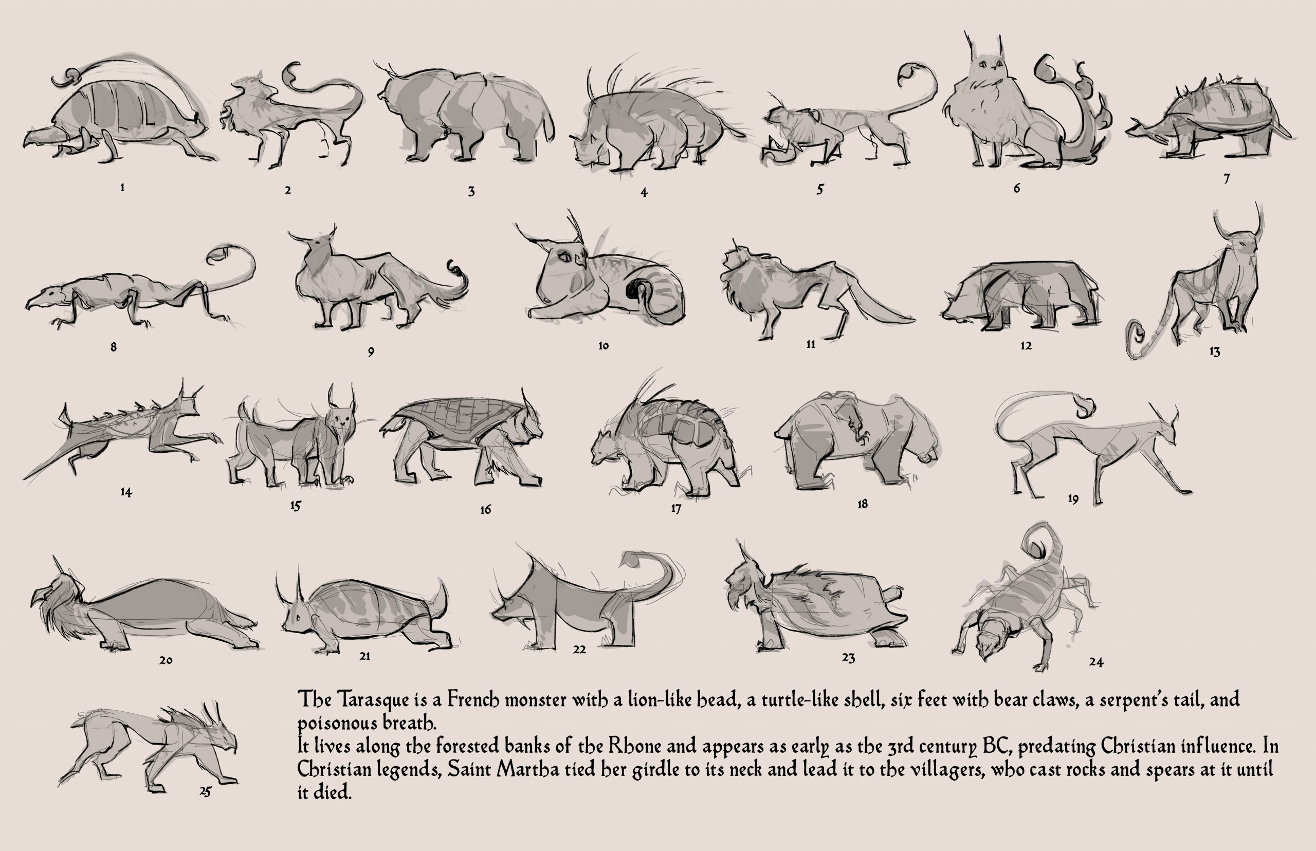 The tarasque presented the unique challenge of combining many different (and conflicting) biological features into a cohesive design. A creature of French legend, the tarasque was said to be a cross-breed from the Leviathan, the biblical sea serpent, and the Onachus, which was a scaly, bison-like beast. The 12th century Pseudo-Marcella describes the tarasque as a half-animal, half-fish dragon, with the face and head of a lion, sharp teeth, the mane of a horse, a turtle’s shell covered in spikes, and six feet with bear-like claws.